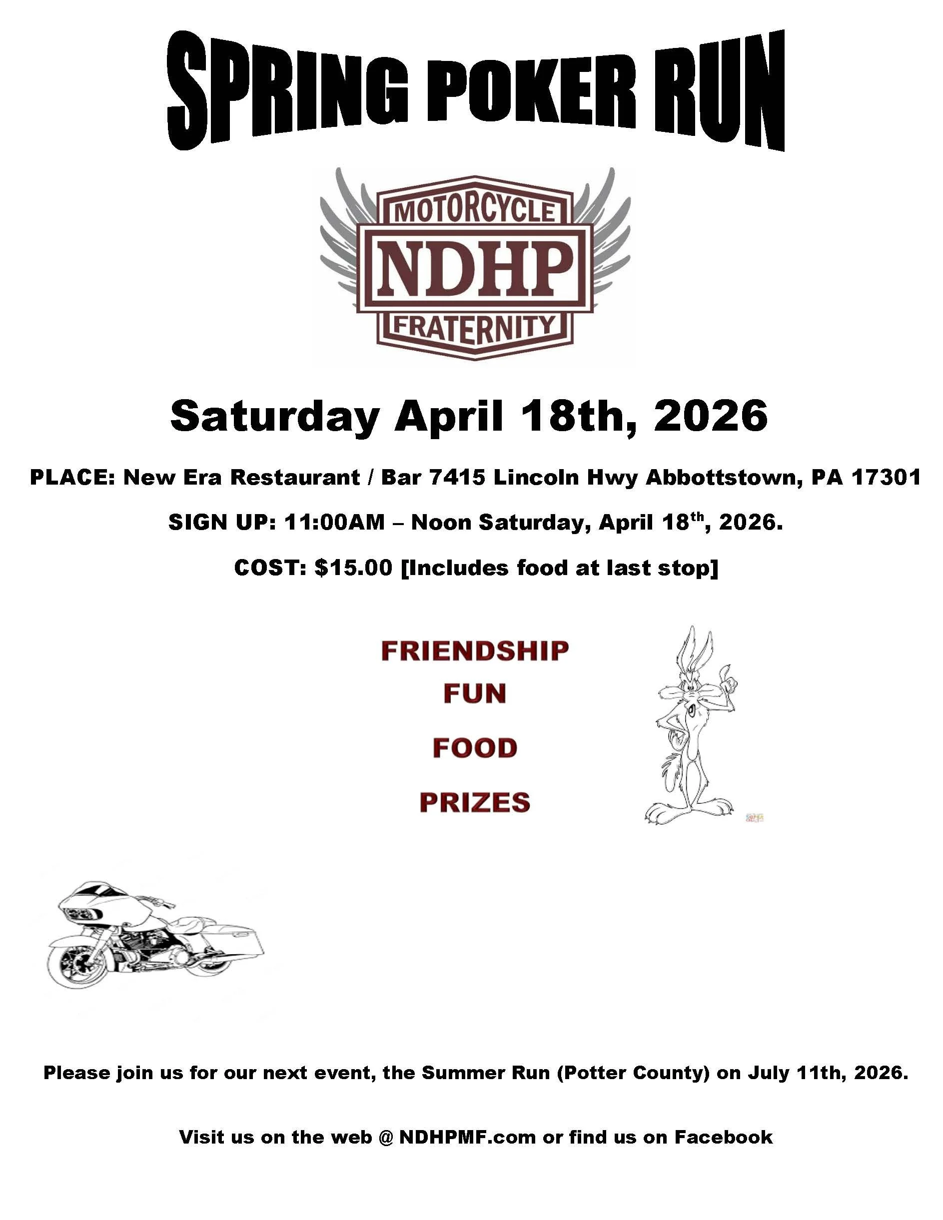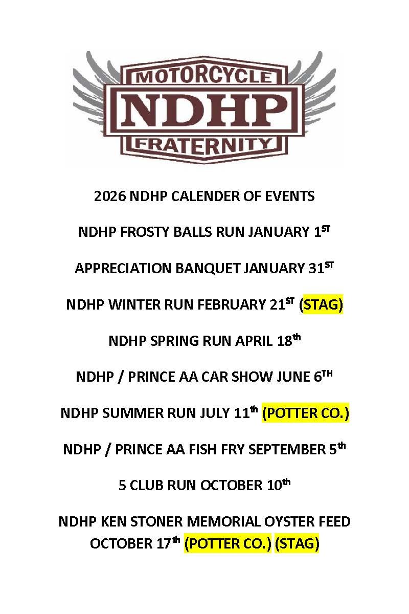 Apr 20 Spring Poker Run Saturday, April 20, 2024 10:00 AM 4:00 PM Google Calendar ICS View Event → Jan 1 Annual Frosty Balls Run Monday, January 1, 2024 11:30 AM 4:30 PM Google Calendar ICS View Event → Oct 14 NDHP Ken Stoner Memorial Oyster Feed (STAG ONLY) Saturday, October 14, 2023 12:00 PM 4:00 PM Google Calendar ICS View Event → Oct 7 5 Club Run Saturday, October 7, 2023 10:00 AM 3:00 PM Google Calendar ICS View Event → Sep 9 NDHP Fall Run Saturday, September 9, 2023 10:00 AM 3:00 PM Google Calendar ICS View Event → Jul 7 to Jul 9 37th Annual Summer Poker Run Fri, Jul 7, 2023 7:00 PM Sun, Jul 9, 2023 12:00 PM Lakewood Inn and Steakhouse (map) Google Calendar ICS View Event → Apr 22 NDHP Spring Run Saturday, April 22, 2023 10:00 AM 4:00 PM Tourist Inn (map) Google Calendar ICS View Event → Upcoming Events * Upcoming Events * Upcoming Events *